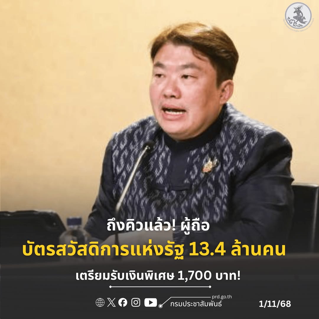 โฆษกประจำสำนักนายกรัฐมนตรี เปิดเผยว่า คณะรัฐมนตรีมีมติเห็นชอบให้ ผู้ถือบัตรสวัสดิการแห่งรัฐ จำนวน 13.4 ล้านคน ได้รับวงเงินช่วยเหลือเพิ่มเติม เพื่อบรรเทาภาระค่าครองชีพและกระตุ้นเศรษฐกิจช่วงปลายปี 2568