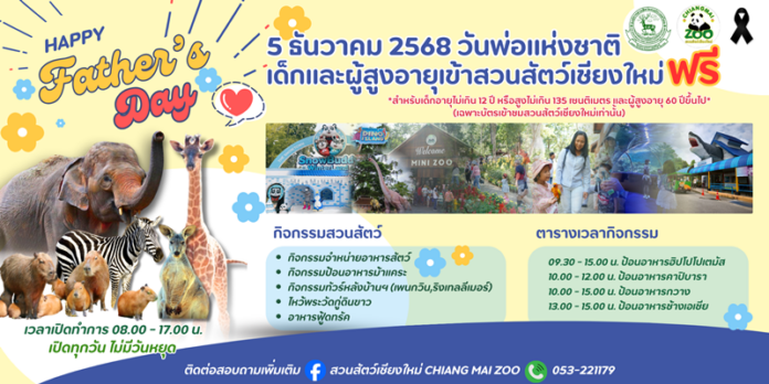 สวนสัตว์เชียงใหม่ เปิดให้เด็กและผู้สูงอายุ เข้าชมฟรี เนื่องในโอกาสวันชาติและวันพ่อแห่งชาติ ประจำปี 2568